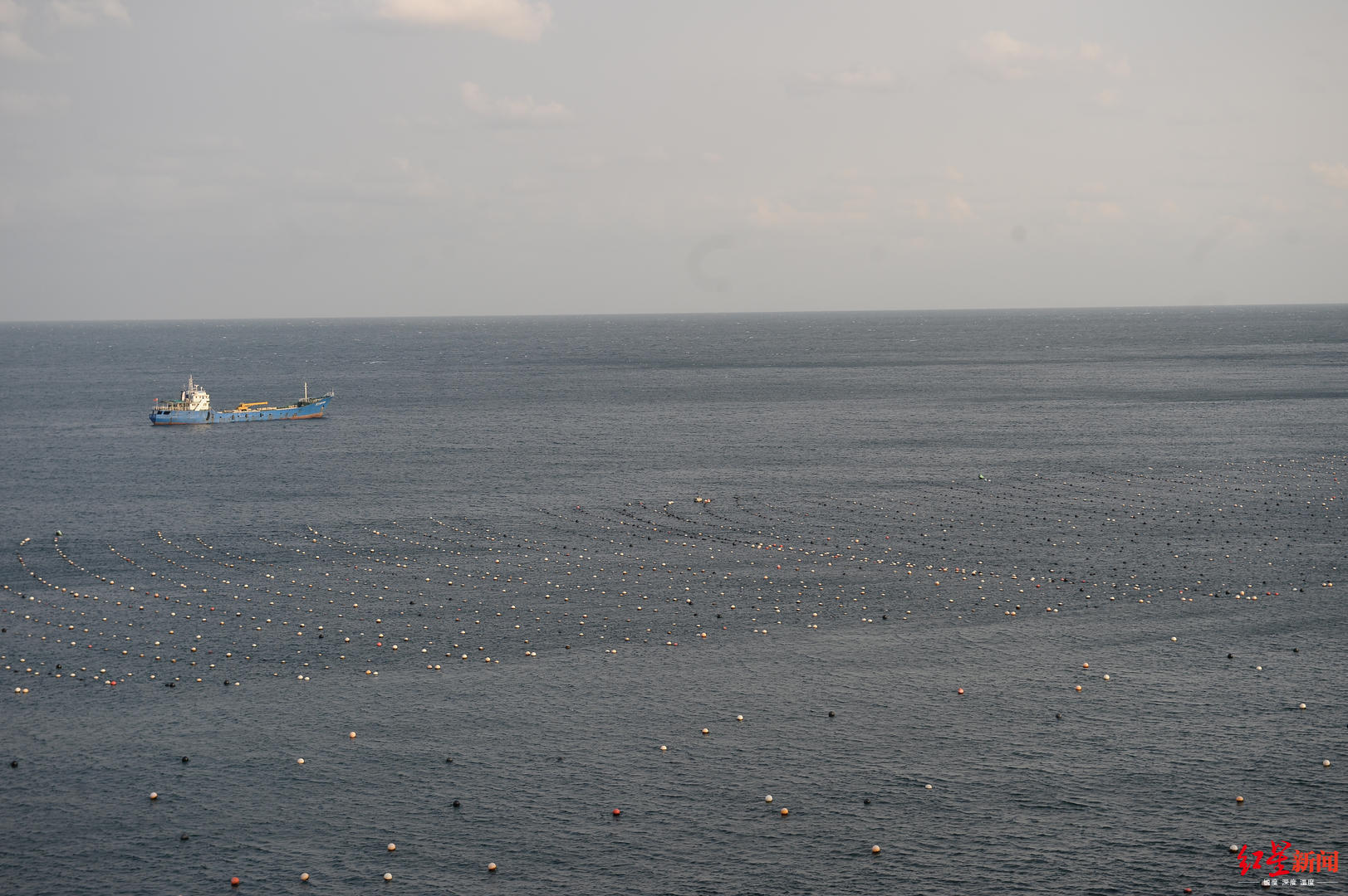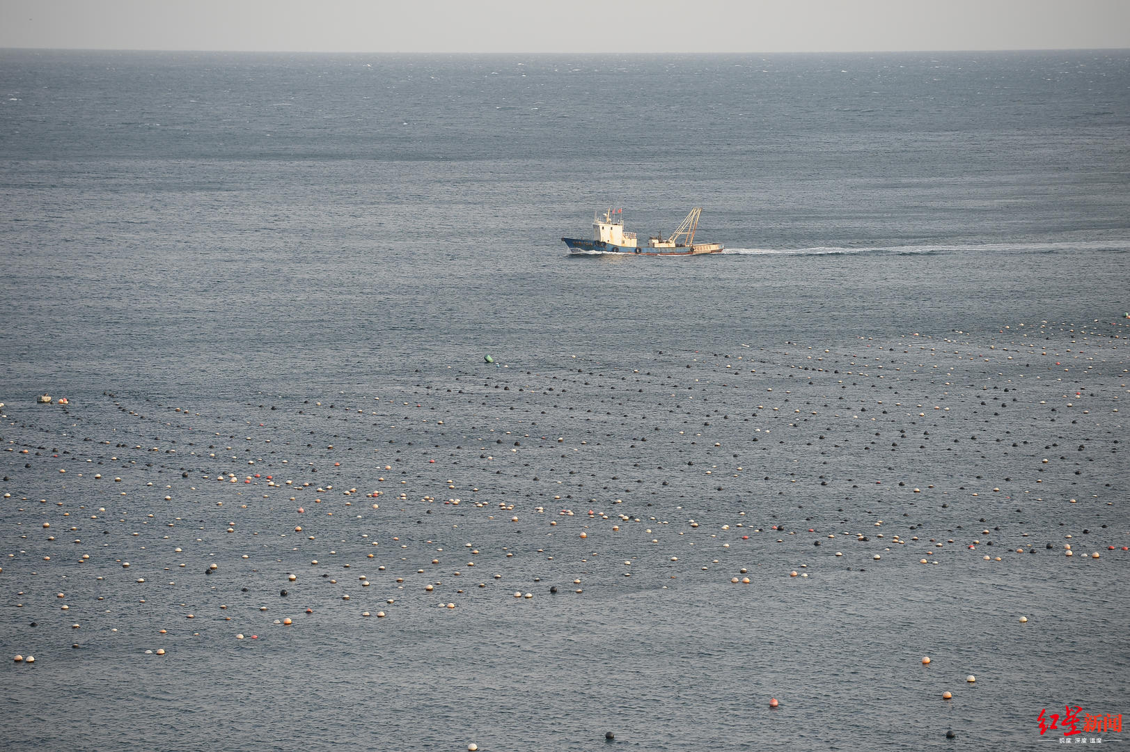 ▲獐子岛附近海域饲养虾夷扇贝用的浮筏,一艘拖贝船驶过