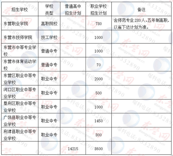 9所职业学校中,东营职业学院招生780人,含师范专业280人,五年制高职以省下达计划为准。市技师学院、市中等专业学校各招生1000人。市体校计划招生70人。