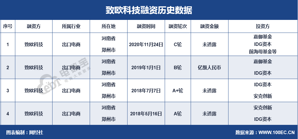 致欧科技在上市前已完成4轮融资,分别是2018年5月获安克创新、IDG资本A轮融资;2018年7月获IDG资本、安克创新A+轮融资;2019年1月获嘉御基金、IDG资本亿级人民币B轮;2020年11月获嘉御基金、IDG资本、前海母基金等C轮融资。