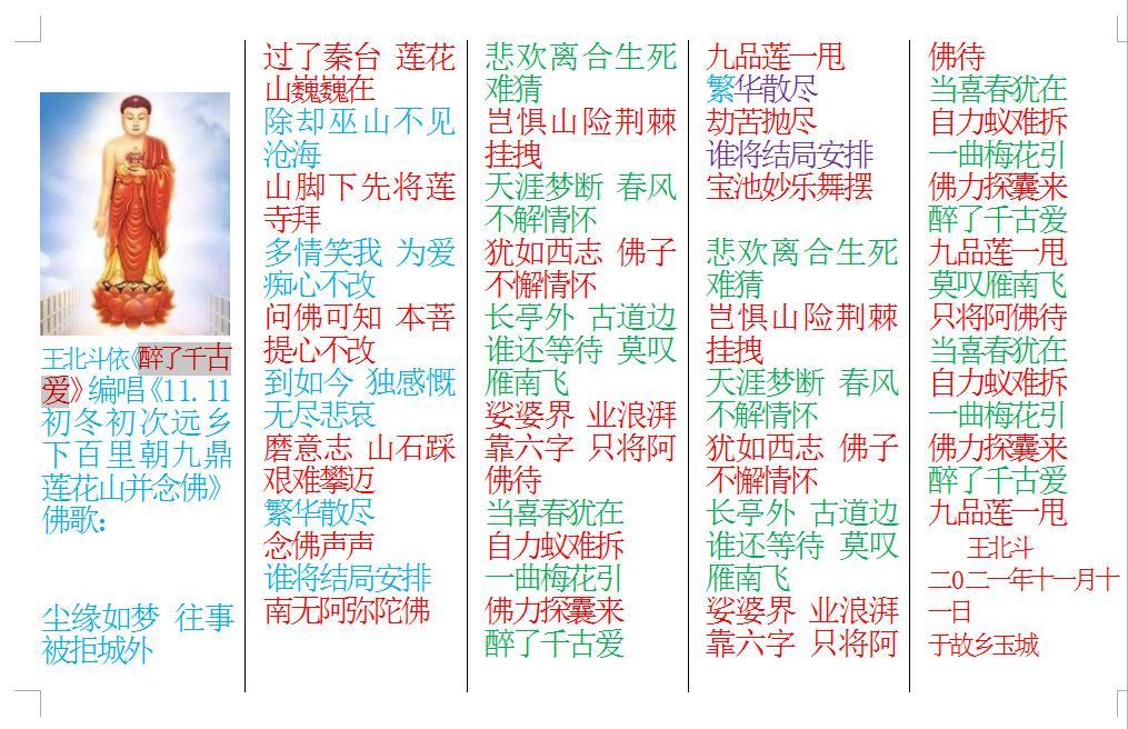 王北斗依《醉了千古爱》编唱《11.11初冬初次远乡下百里朝九鼎莲花山并念佛》佛歌: