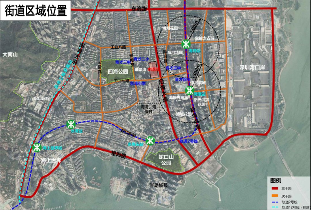原联合饼干厂城市更新项目位于南山区招商街道,后海大道与蛇口工业七路交汇处,距离地铁2号线海月站约580米(百度地图测量,仅供参考),轨道交通便利,周边配套设施成熟,有海岸城购物中心、深圳湾体育中心、深圳湾公园、蛇口太子港等,是深圳首屈一指的豪宅区域。