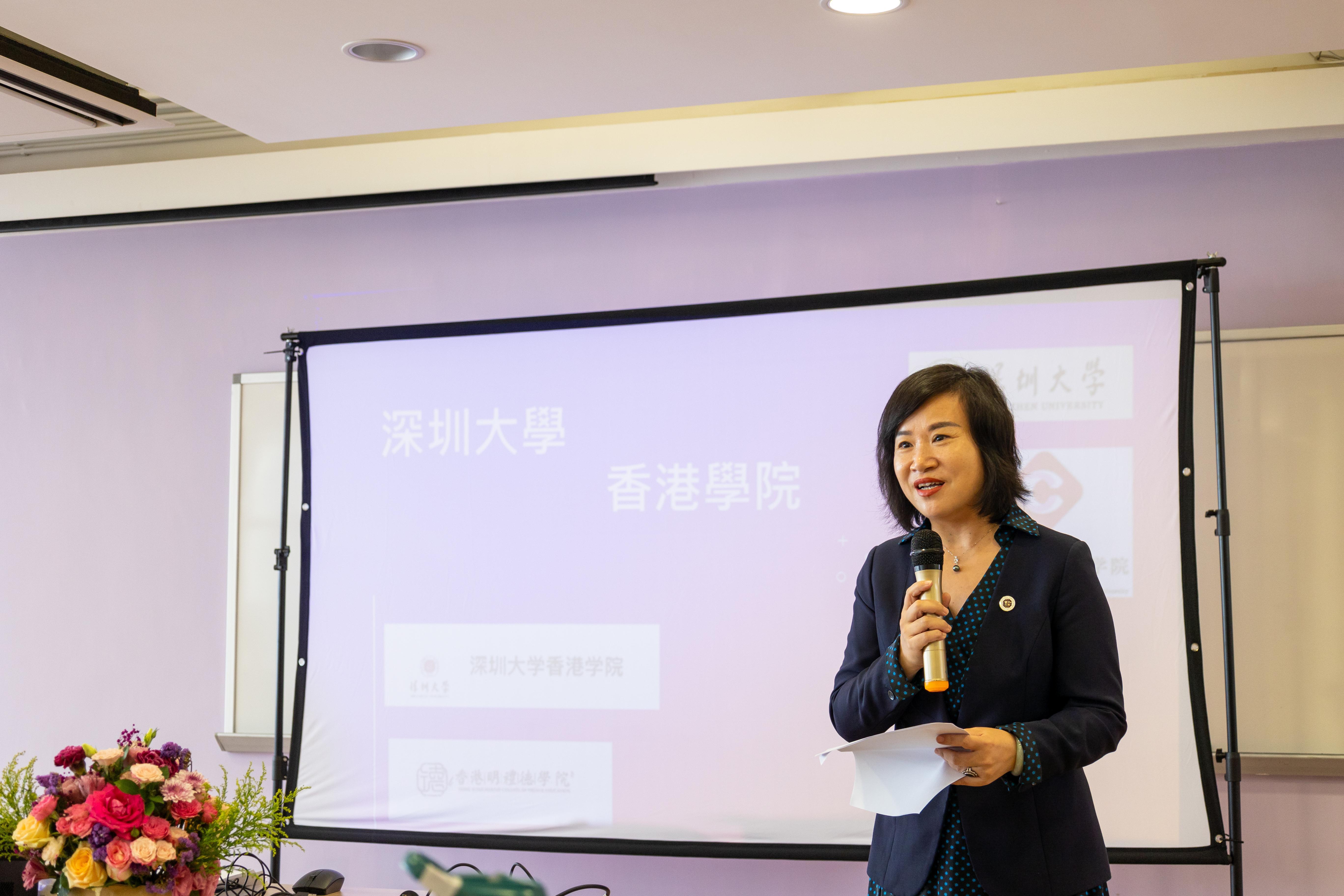 非本地课程主办者代表香港明礼德学院院长刘博微致辞,鼓励同学们积极融入香港社会,积极参与各类社会实践活动,从中积累宝贵的经验。