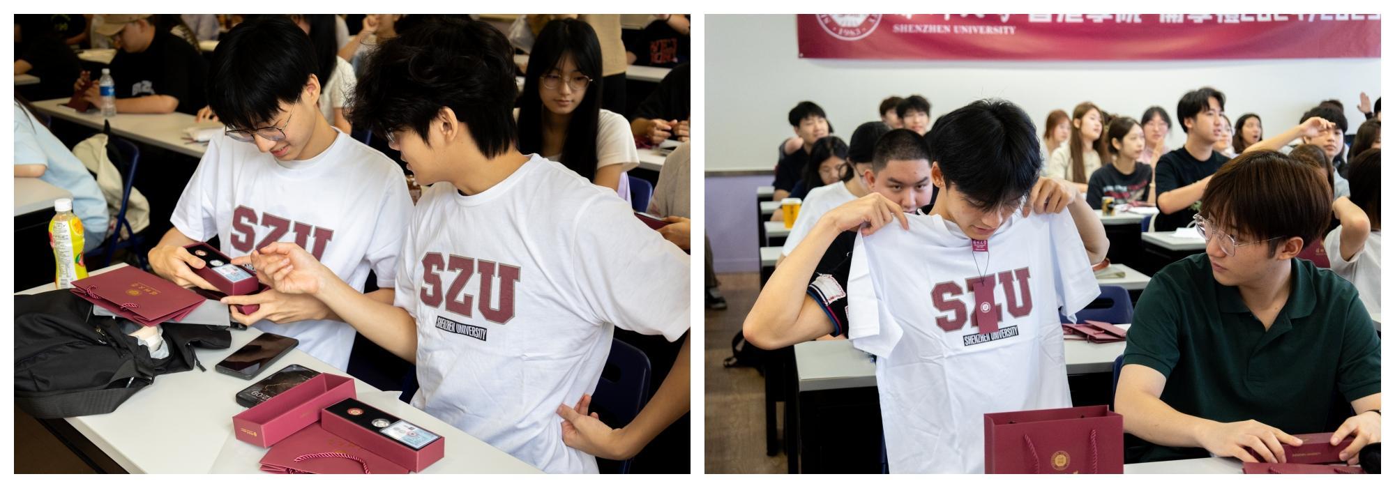 深圳大学代表团还为香港学院学生赠送了校徽和校园文化衫。新生代表李嘉晟在发言中表示,作为深圳大学香港学院的第一届本科生,他深感自豪。深圳大学建立香港学院是为香港青年提供优质高等教育资源的一次全新探索,既是时代的机遇,也是香港青年成长与发展的新起点。他希望通过四年的学习不断提升综合能力,掌握扎实的学术知识,习得丰富的实践技能,与同学们携手并进,用“千磨万击还坚劲”的精神砥砺前行、探求真理、追逐梦想。