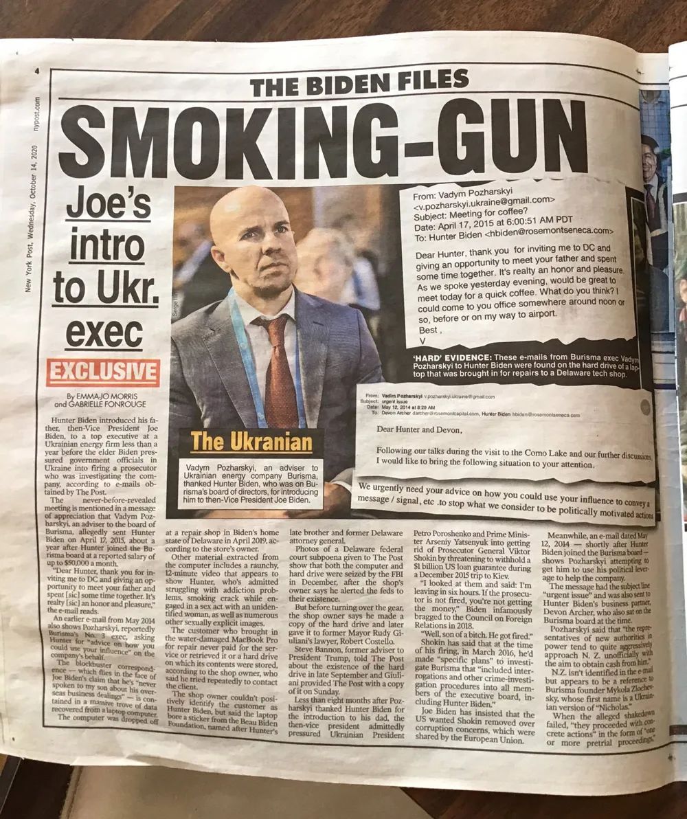 大意是说,拜登家把一台损坏的笔记本电脑送去修,结果老板在里面发现了一系列电子邮件,可以证明拜登的小儿子亨特,利用父亲的影响力其父职权谋取私利,与乌克兰商人进行权钱交易的事情。
