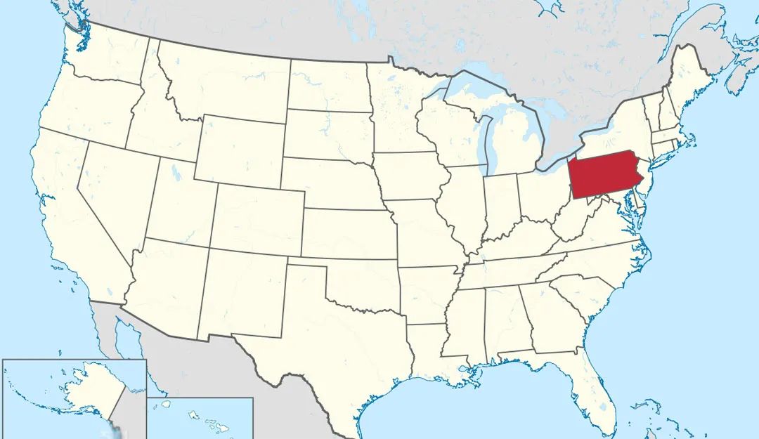 第二大摇摆州宾夕法尼亚州,位于美国东北部,与纽约州、新泽西州等相邻,是美国人口第五大州(1280万人),有20张选举人票。