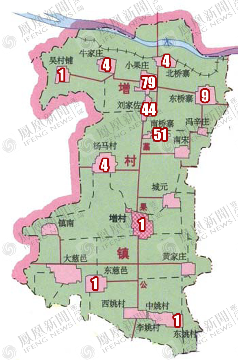 纵观目前已掌握的全部265名确诊病例,一个明晰的特点就是,疫情高度(75%)集中在增村镇,特别是小果庄、刘家佐、南桥寨3个村(66%)。