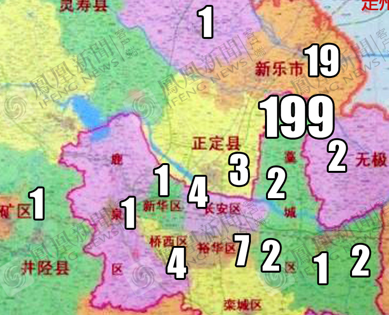 在石家庄其他区县,紧邻增村镇的新乐市检出19例,石家庄市区(长安、裕华、桥西、新华四区)12例,其他区县12例,共计43例。