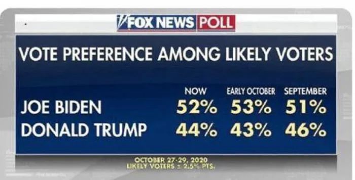 即使是共和党党媒FOX所最新公布的民调,拜登在锈带蓝州的领先优势,密歇根达到了12个点,威斯康星和宾夕法尼亚5个点,全国领先8个点。
