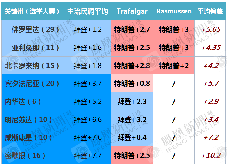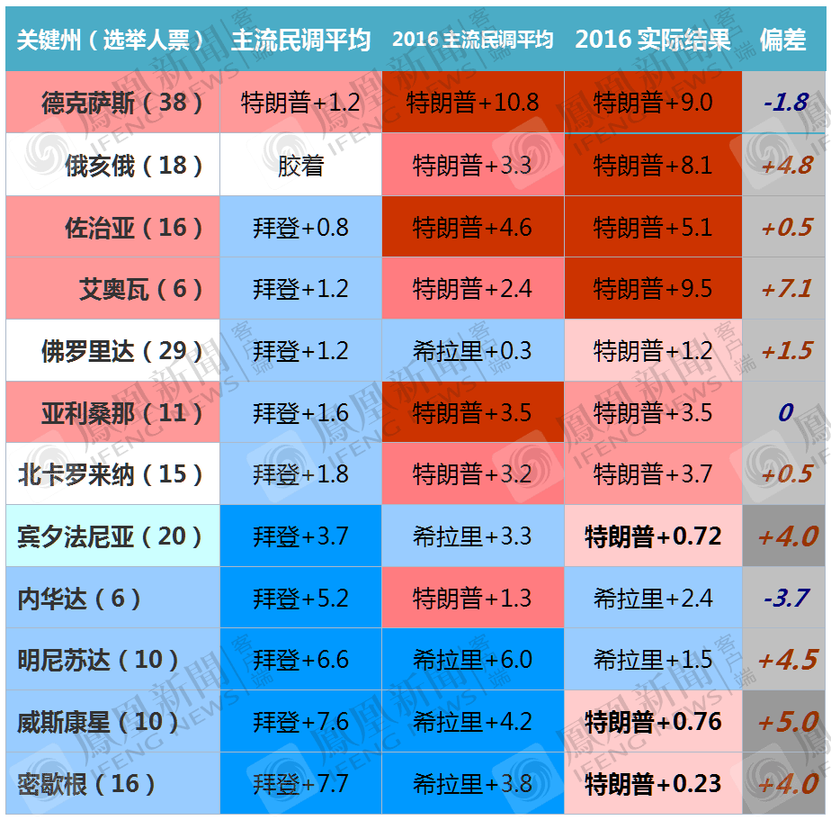 就2020年本次大选的12个关键州而言,2016年民调的平均偏差是2.2个点。