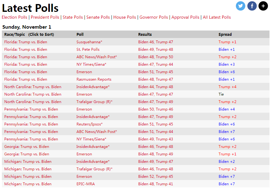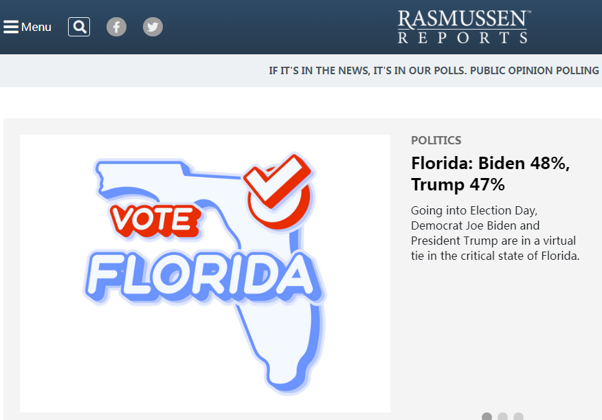 Rasmussen的最后民调也显示,拜登在佛州领先1个点。