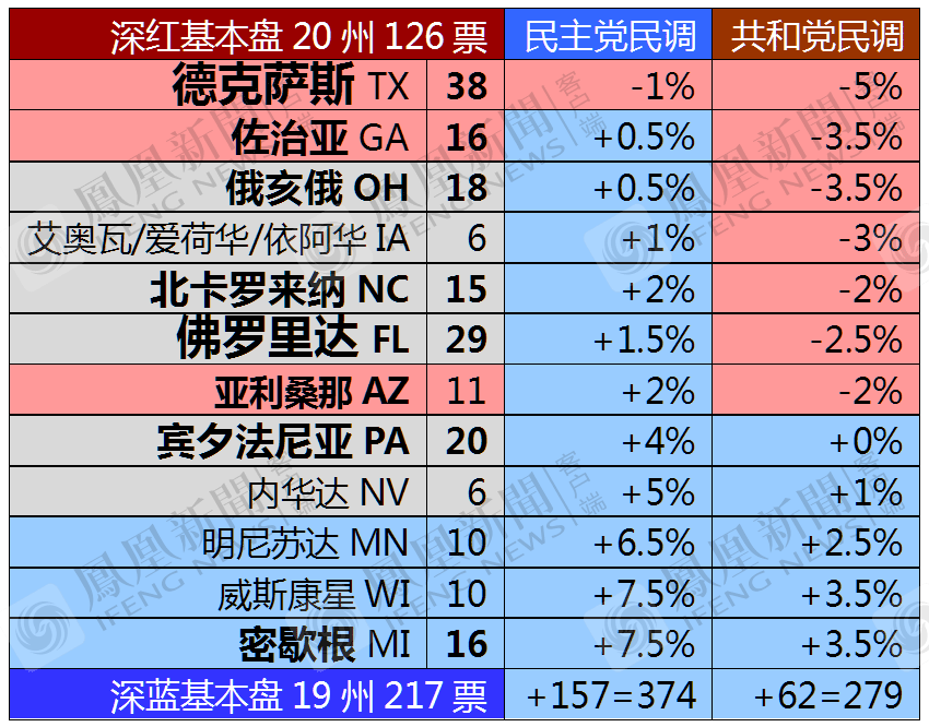共和党则只有126票深红+71票浅红基本盘,一共197票。必须四大摇摆州(佛州、宾州、俄州、北卡)82票一个都不能少才行。两者的难度是截然不同的。