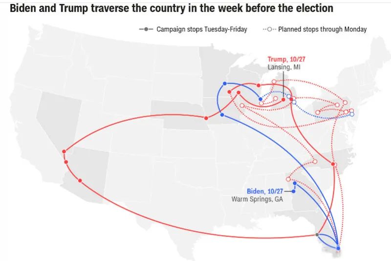 虽然部分州的提前投票率已经超过8成,但两大阵营依然加紧冲刺,不敢懈怠,在各个摇摆州举办最后的竞选集会。