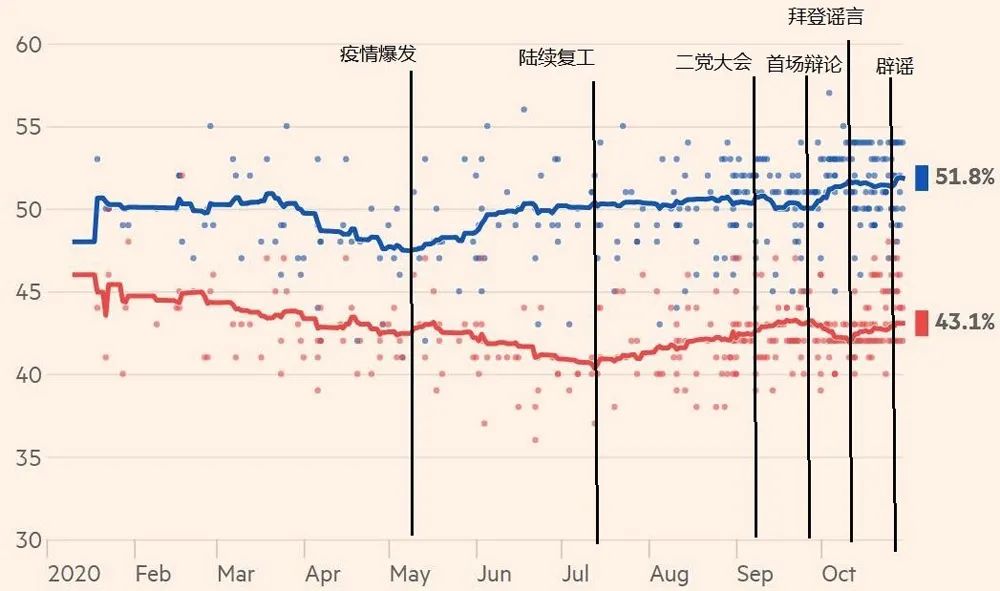 这次各家民调显示的拜登领先幅度与趋势,比四年前希拉里也大得多,而且关键是持续稳定得很。