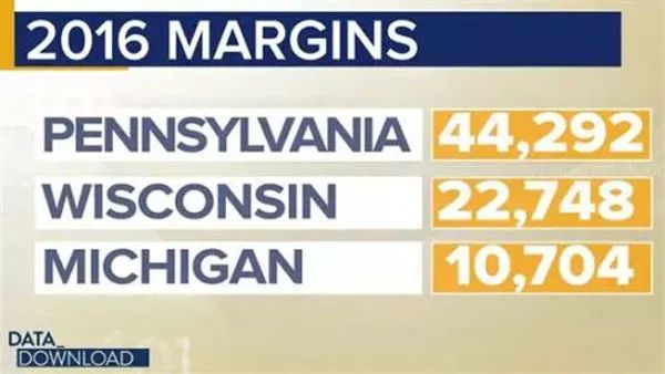 以及蓝转红的三个州:密歇根(希4.8%变为川0.3%)、威斯康星(希5.5%变为特0.7%)、宾夕法尼亚(希2.6%变为特朗0.7%)