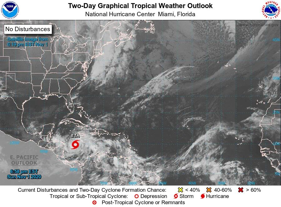 而新一个热带风暴“埃塔”(Eta)刚在加勒比海中部生成,预计未来5天不会登陆美国。