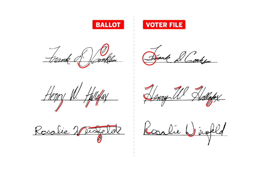 道理就和信用卡上的签名一样,通过此前选民登记卡或选民其它身份文件上的签名是否一致来完成判断。