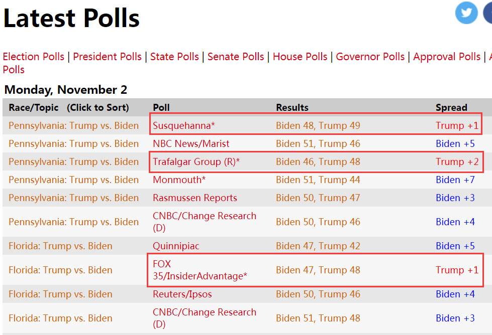 严格说,这是落入了不安全的误差范围值(3%)内了。同时,有2家特立独行的“共和党民调”宣布,在宾州,特朗普领先: