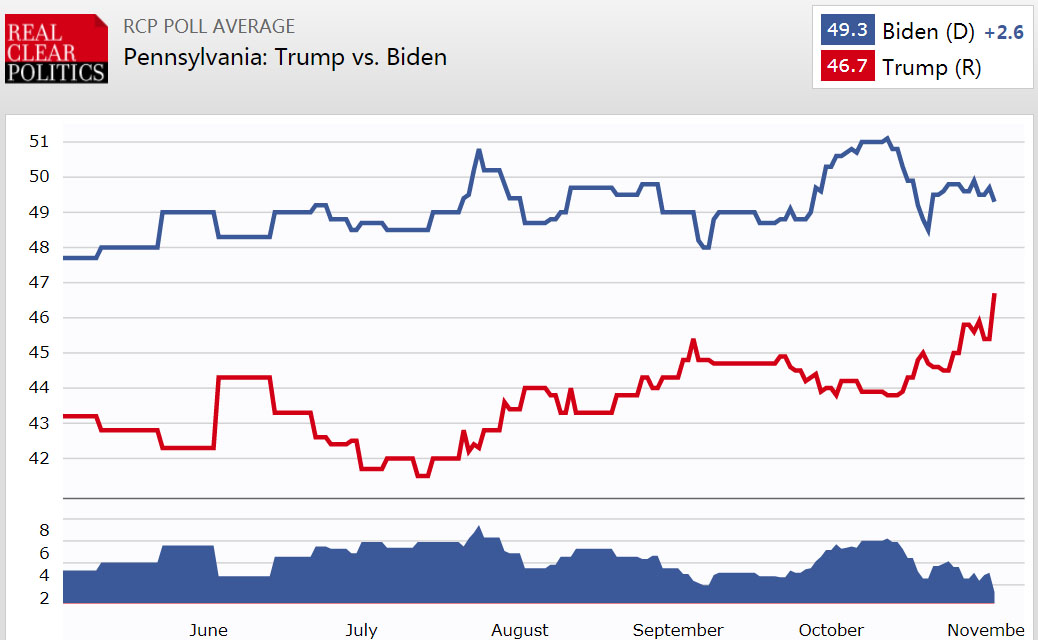 更令民主党紧张的是,根据最新民调,拜登在宾州的领先幅度继续缩窄,从10月底的领先3.7已经变成最新的2.6了。