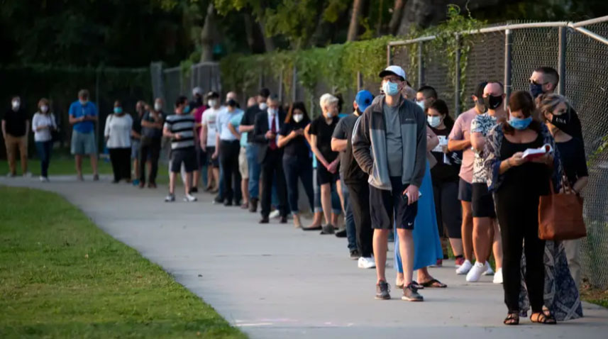 就这样,自从10月12日星期一,美国一些州开启提前投票站之后。人们就冒着新冠感染的风险,戴着口罩、带着折叠椅、遮阳伞和凉席在停车场周围排起了队。