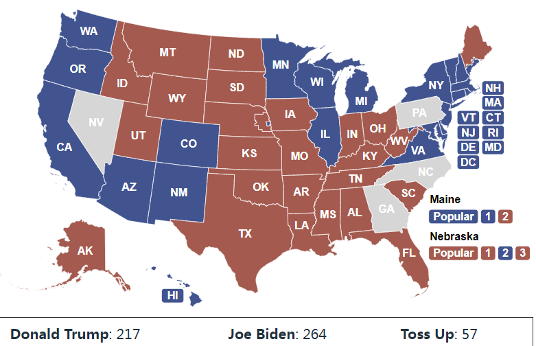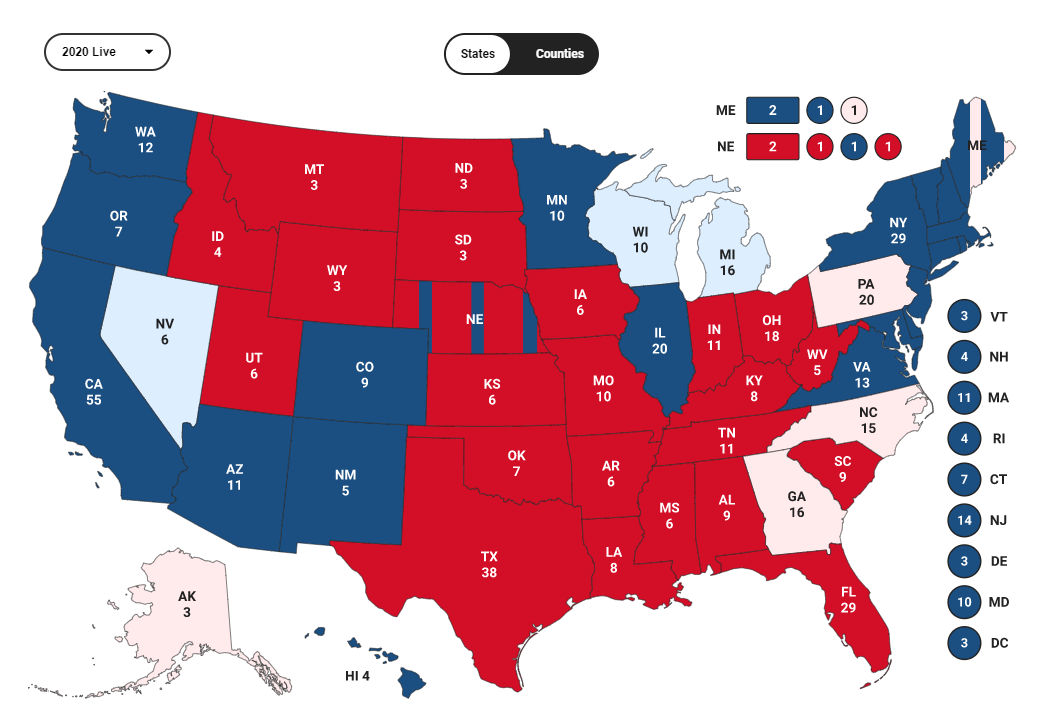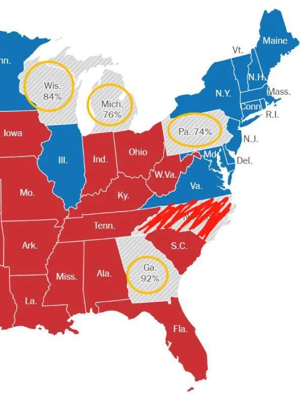 现在,只要赢下内华达(NV)、威斯康星(WI)、密歇根(MI),拜登就能达到270张选举人票当选,宾州(PA)、北卡(NC)、佐治亚(GA)都是锦上添花了。