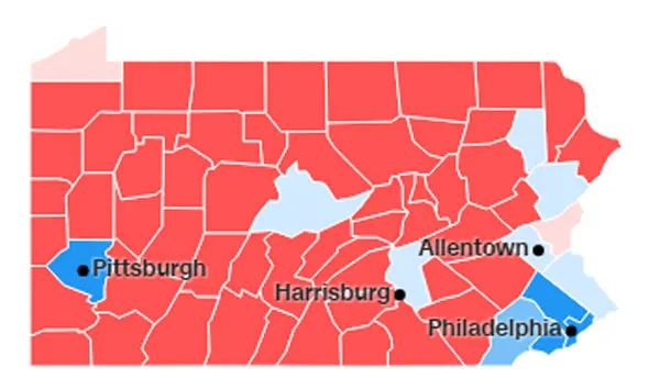 宾州一东一西的费城、匹兹堡两个大城市及周边县还有上千选区没计报。