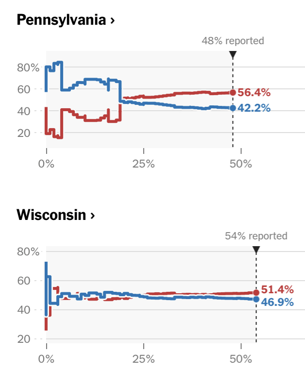 威斯康星在开票53%的时候,共和党还领先30万、12个点,开到78%的时候就只剩12万多、5个点了;继续开到89%,已经转翻微蓝。