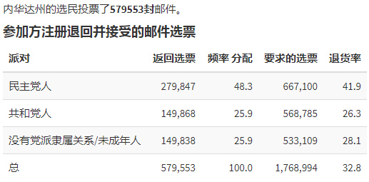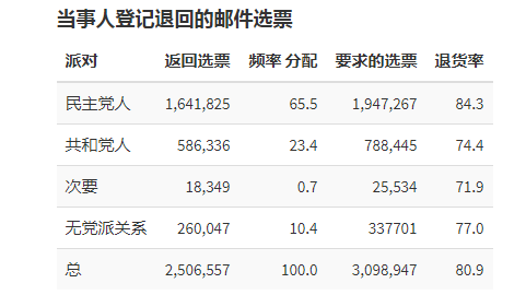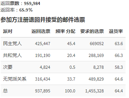 在早期250万张邮寄投票里,登记政党的选民数据是:民主党选民164万、共和党选民58万、无党派等28万。民主党多出100多万,双方形成了3:1的差距。