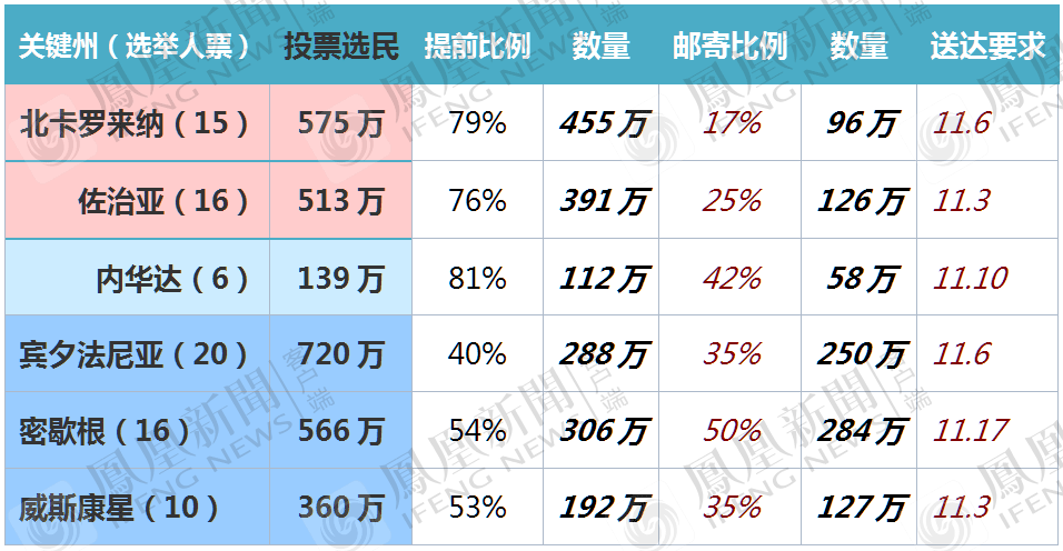 而正是宾夕法尼亚(PA、20)、密歇根(WI、16)和威斯康星(WI、10)这三个民主党的关键州,都不允许在选举日之前开始统计邮寄选票。
