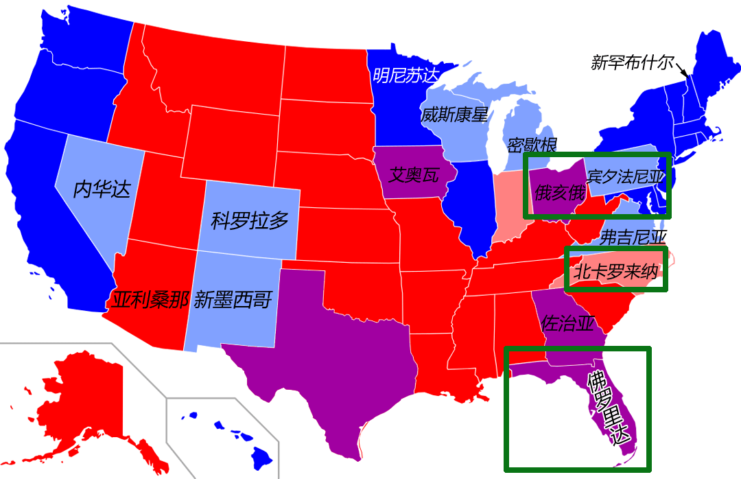 尽管当时民主党在三州已经落后30万甚至60万票,落后点数高达10~15点,看上去似乎是一片惨败,地图刷红色。