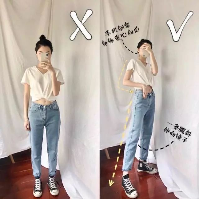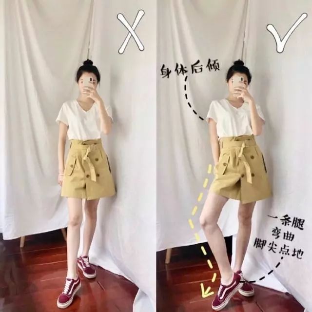 当你的身体前倾的时候拍照会显得矮,呆呆站着又不好看,这时候你还可以将自己的身体稍微的后倾,一条腿在后面作为重心,一条腿稍微弯曲脚尖点地,显得俏皮可爱还显得特别高,很好看。