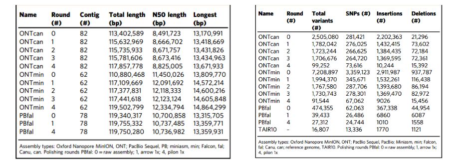 筛选完整的和部分基因的基础上使用Quast对TAIR10参考基因组的全基因组比对。结果显示,ONTmin组件具有最高的完整性,紧跟其后的是ONTcan组件。Polish后的ONT组件的基本质量和连续性与同一基因组最先进的PacBio组装相当。