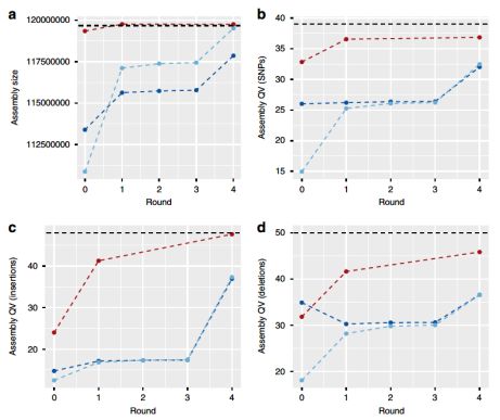 使用三轮racon和一轮pilon对组件进行polish(图1)。发现racon显著地提高了ONT组件的总长。只有第一轮racon和最终pilon的polish对单碱基错配、错误插入和错误删除修正具有强烈影响(图2)。