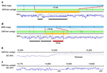 生成265个光学基因组图谱,contigs(cmap)为4.8 Mb,N50=695 Kb。通过光学图谱来评估ONT序列组件的质量。经过racon的polish之后,ONTmin对应到Bionano图谱上的contigs由115.9 Mb增加到118.4 Mb。Pilon的polish改善了两种组装类型,将ONTcan中FP/FN比值从0.33/0.12降到0.01/0.04。