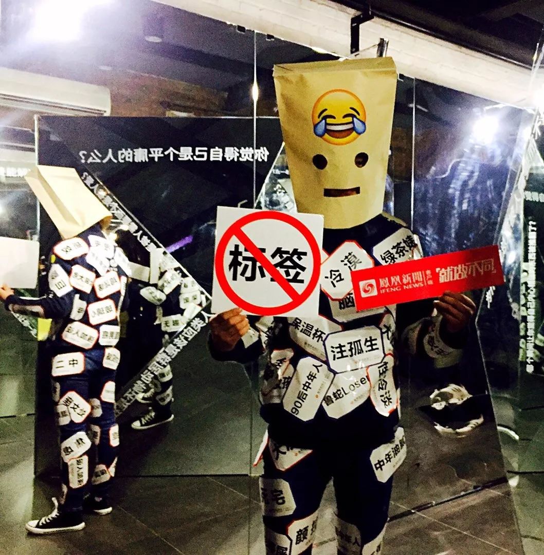 11月26日,青年志年度大会「青年日2017:未 来 自 年 轻」在北京751D·Park中央大厅正式开启,作为大会宇宙媒体合作伙伴的凤凰新闻客户端在活动现场以#年轻从不被标签定义#为主题发起了标签人快闪互动,“戏精”、“中年油腻”、“焦虑”、“丧”等各种热门标签词被做成纸质标签贴在“标签人”身上,形象直观地讽刺了当下乱贴标签的现象。