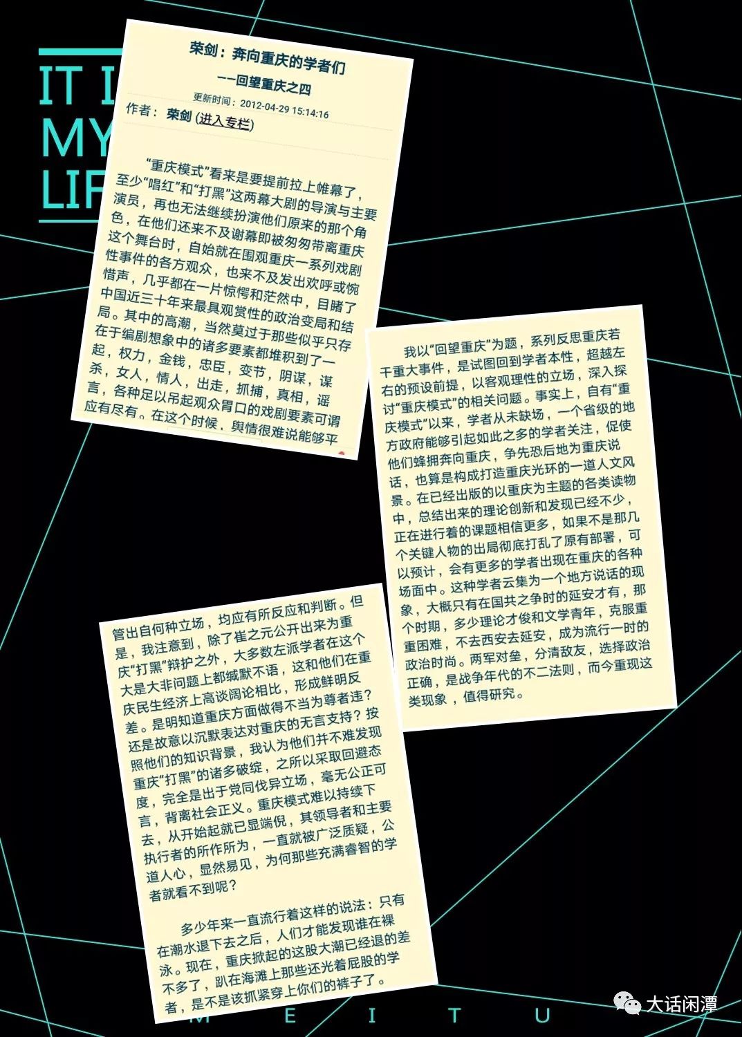人不能免俗,我亦如此,这话确实说得到位。以我之见,中国新左派和中国自由派理论争执二十余年,一直未能分出胜负。新左在政府资源的大力支持下,垄断大学和研究机构,自2008年开始大肆鼓吹国家主义和中国模式,在2012年重庆模式期间达到高潮。正是在这个当口,我写了万字长文:《奔向重庆的学者们》,指名道姓揭露中国新左整体沦陷,竞相沦为“以经术缘饰吏治”的奴才,最后在重庆模式的潮水退去之后,露出光着屁股裸游的窘态。此文被著名媒体人石扉客誉为“世纪名篇”。不能说这篇文章一拳击倒了新左,但至少让众多蜂拥奔向重庆的新作学者们无地自容。