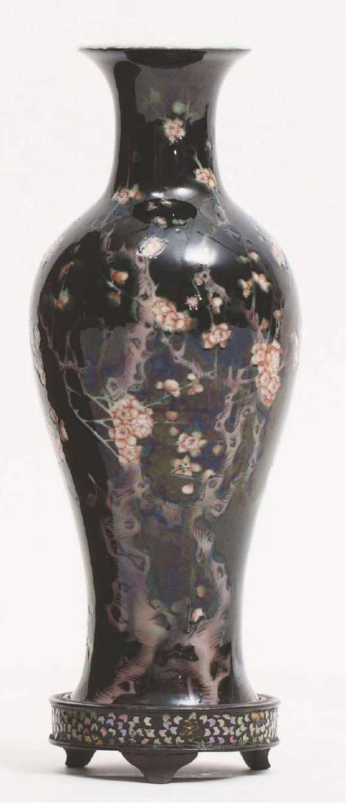 通过观察分析和试验,以上黑彩的彩绘工艺都是采用珠明料描绘图画,再在其上罩一层水绿,经低温烘烧而成,发色黝黑光亮,并泛出隐隐的绿色。如果不罩水绿,烘烧出来的画面与釉面粘结不牢固,稍经磨损即脱落,而且黑色黯然无光。在康熙黑彩白梅图中,用水绿罩在珠明料圈成的白梅花线条上,将整朵梅花覆盖,形成绿萼梅的效果。