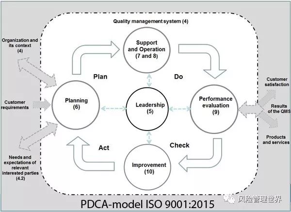 像我们比较熟悉的ISO9001质量体系标准,采用的就是典型的PDCA模型。你还可以发现ISO31000今天最新框架中的核心领导力与承诺,就是从ISO9001的PDCA模型中借鉴过来的。