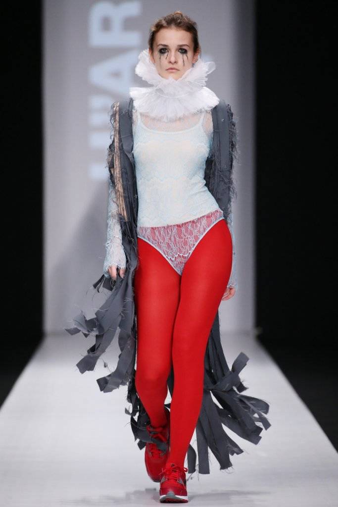 HSE Art and Design School 2018秋冬成衣秀场上,在导师Maria Smirnova帮助指导下,学生们以现代街头文化重新解读文艺复兴拉夫领:首先使用薄纱组建立领框架,然后以晕开的眼妆搭配外穿式透视蕾丝One-Piece连体裤、碎片化外套大衣以及四方连续块状拼接的PVC外套、瑜伽紧身裤等,展现出时间的跨度,凸显主题——“YOUTH FOREVER”,而纯白衬衫裙的两个抛袖体积被故意放大,左边降落变成主教袖,右边挺括变身羊腿袖,将不对称的雕塑式美感融入集合。
