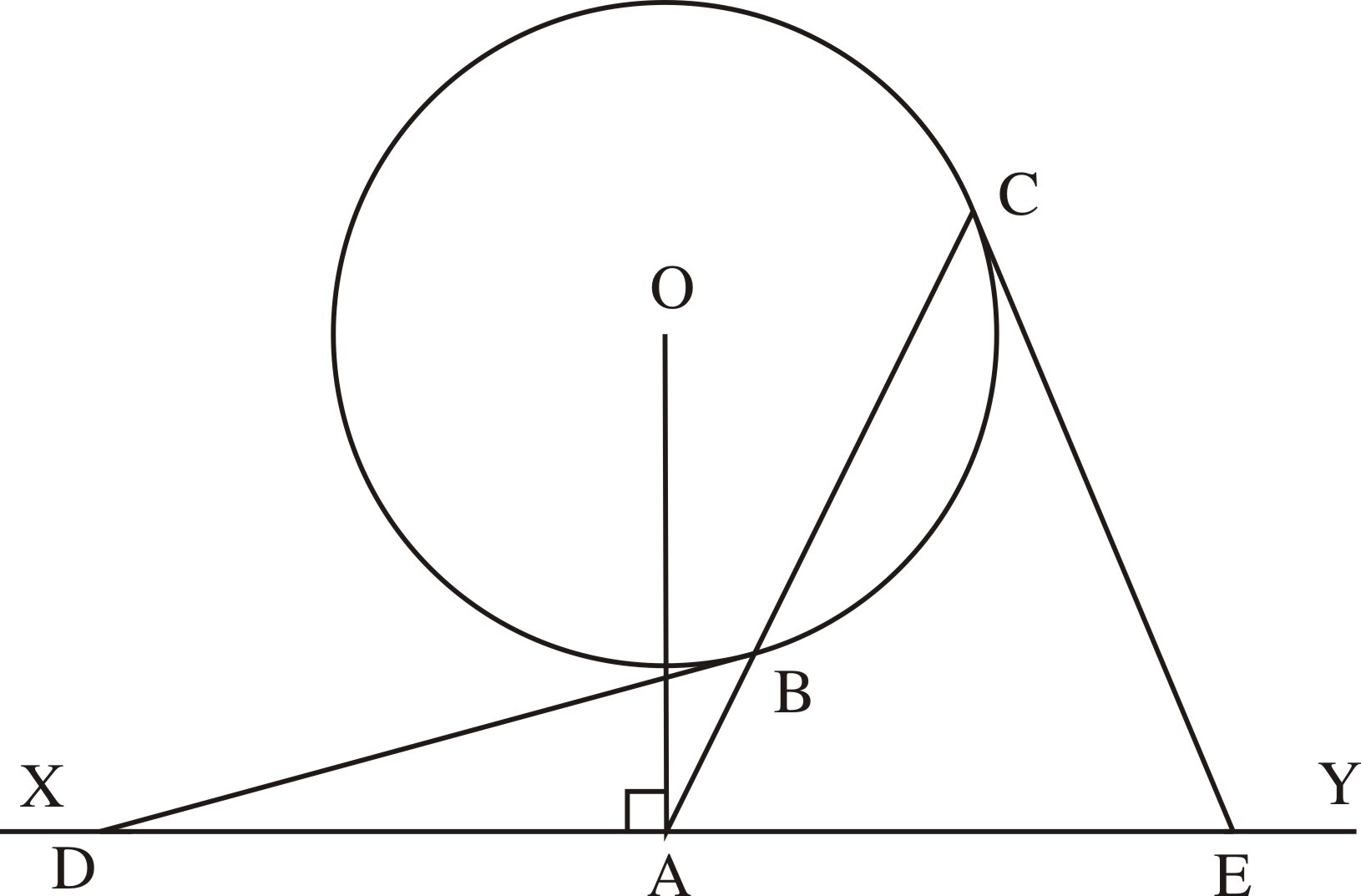 例5 如图3-100,已知:XY是⊙O外一直线,OA⊥XY,垂足是A,过A作⊙O的割线交⊙O于B、C,过B、C分别作⊙O的切线交XY于D、E。求证:AD=AE。