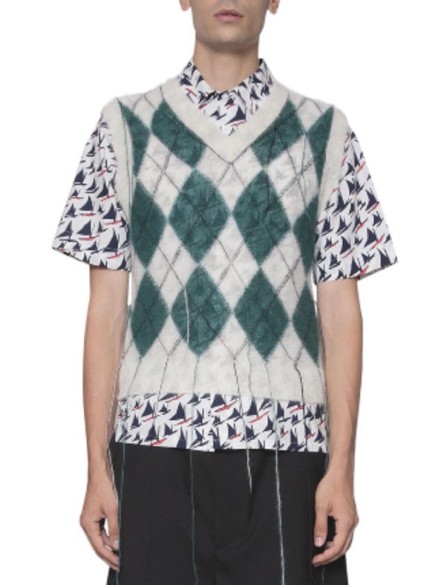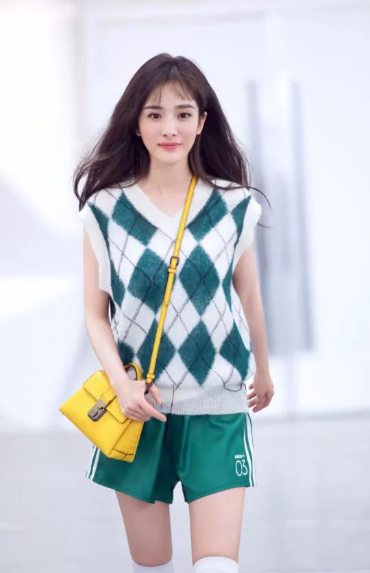绿色菱格针织背心搭配绿色运动短裤,清新十足,非常契合现在的世界杯主题。