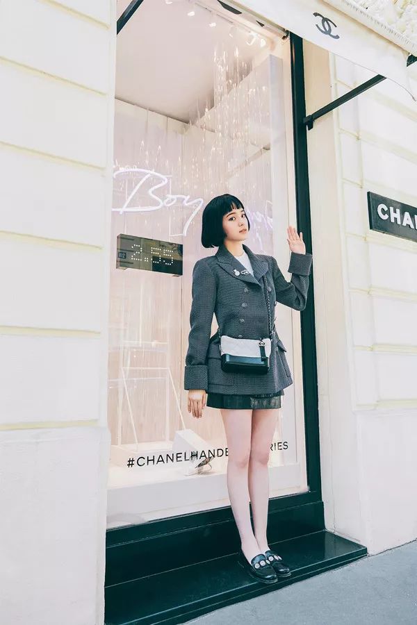 欧阳娜娜身穿CHANEL灰色外套搭配黑色短裙,遵循了上宽下窄的搭配法则,简约却气场十足,一双大长腿十分吸睛。