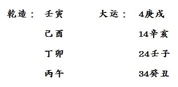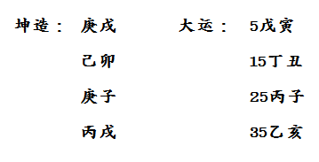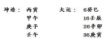 另外,女怕合多,合多就是异性朋友多。初运己卯,卯为桃花,卯戌合,桃花入命,虽然年龄尚小,亦会与异性相亲相爱。次运戊寅,戊为七煞,经不住男子的诱惑,必有失节之事。寅运正构成寅午戌三合局,合住夫宫,必婚。1998年戊寅,流年七煞主事,婚外恋又是一种必然。1999年己卯,卯与命中戌合,桃花入命,大运丁丑,两丁争合日主壬水,走马灯似地不断变换“把式”,难怪夫主对其严加约束。不过,命中注定的故事还会演绎下去。