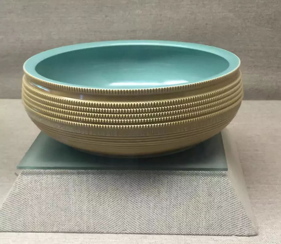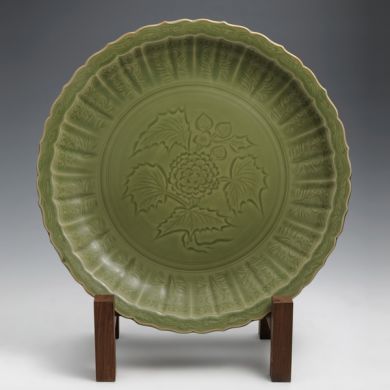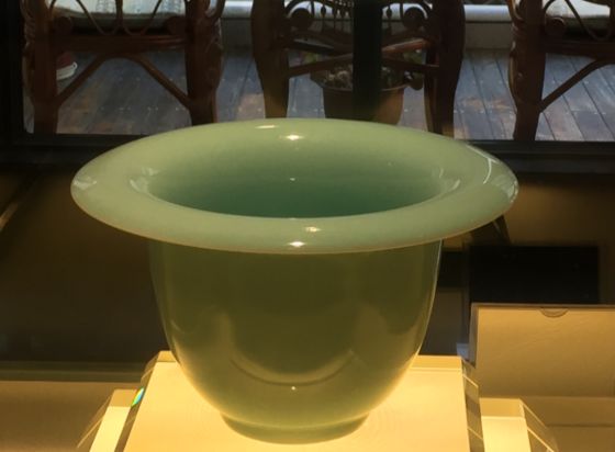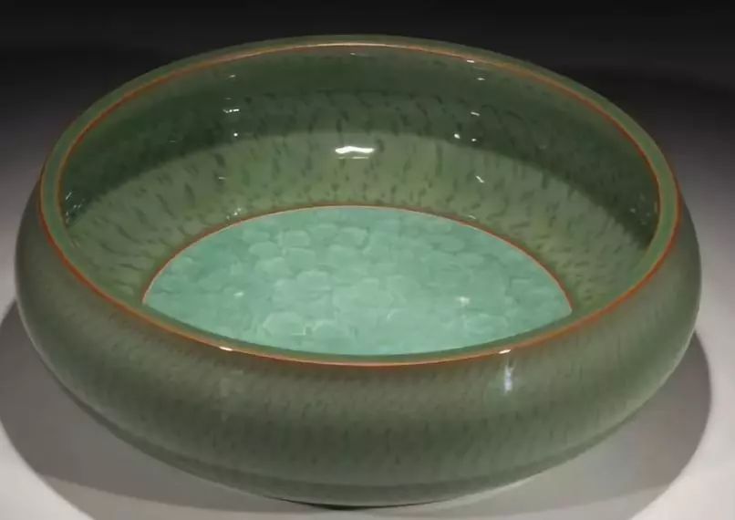 弟窑则以晶莹润泽的青釉闻名天下。白胎厚釉、光泽柔和、温润如玉,其有棱线处,微露白痕为“出筋”,脚呈红色为“朱砂底”,被誉为“青瓷之花”。