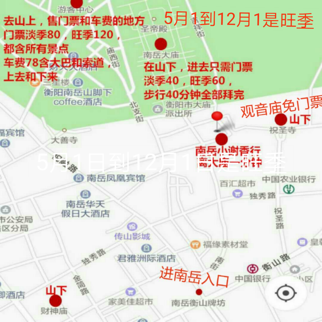 也不要坐司家车,南岳中心景区祝融峰禁止车辆通行,有私家车主篡改南岳衡山景区导游图,将南岳方广寺标注成祝融峰,欺骗来岳游客称方广寺是祝融峰,自己的车子可以直接到"祝融峰" ,搭乘游客到方广寺收取费用500元含门票和车费,其实方广寺根本就是不要门票的,重点是你花了500元连景区的门都没进。