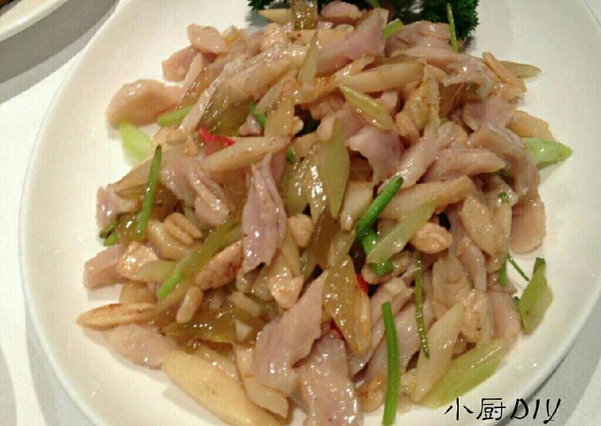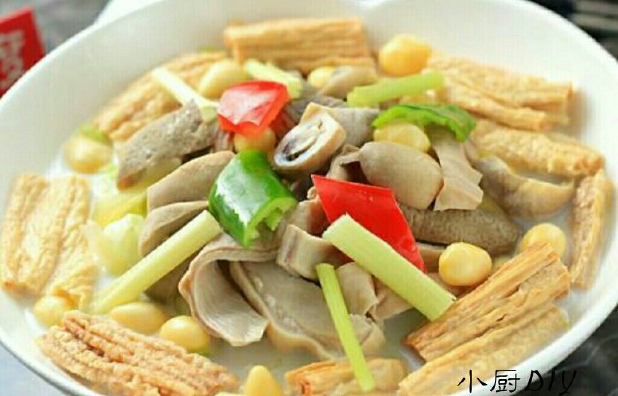 2. 锅里热油,放入沙姜和姜片爆香。放入处理好的脆肚煸炒,烹入料酒。放入2勺清水烧开,放入炸好的腐竹段,白果煮10分钟。放入调味料,撒入香芹段,稍微煲一下即可。