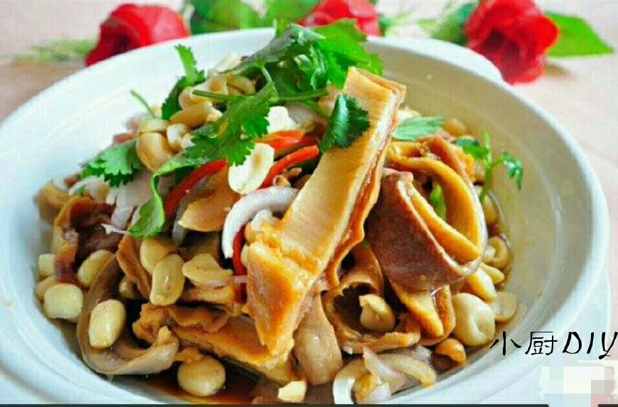 处理好的脆肚300克,酒鬼花生100克,洋葱50克,香菜10克,蒜子10克,青红椒30克,葱段50克。