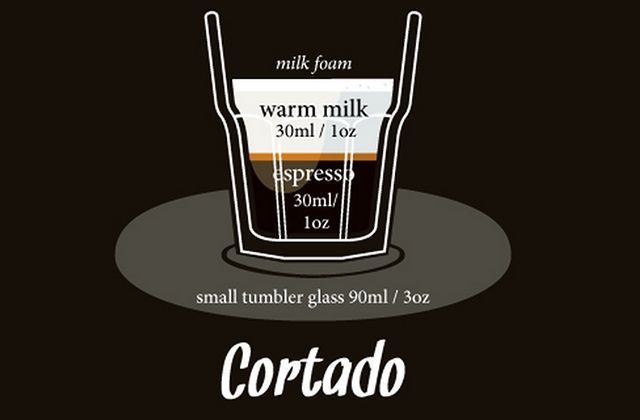 Cortado是在浓缩咖啡上面加上少量的温热Steamed Milk,以淡化浓缩咖啡的酸味.通常,牛奶和咖啡的比例在1:1到1:2之间.