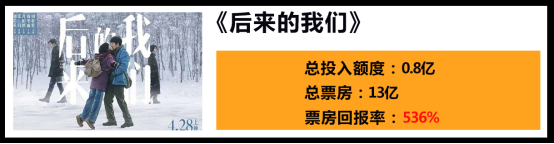 就在昨天由刘若英执导,张一白监制,井柏然、周冬雨、田壮壮主演的青春文艺片《后来的我们》票房收益已全部结清。这部制片成本7000万,电影拍的速度非常快,去年10月中旬开机,到12月24日杀青,只拍了两个月,这部只卖情怀的电影,总票房是13.59亿,净利润率达到582%,也就是说你当初投入了10万元的《后来的我们》的版权,光票房的收益达到58.2万元的收入。