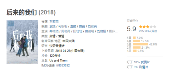 《后来的我们》在未上映之前不被看好,在豆瓣上的评分也只有5.9分,很多人都说刘若英第一次当导演没有经验,只卖情怀不卖情节,事实证明这部分人也是对的,后面的吴孟达《新乌龙院》和《爱情公寓》原版人马再聚首的大电影都没有获得很大的成功,这其中的缘由大家都是知道的,那就是《后来的我们》进行了电影版权的转让。