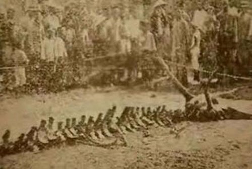 在《营口市志》第一卷中记述:“(1934年)8月8日午后,辽河北岸东小街一农民在附近苇塘发现一巨型动物白骨,长约10米,头部左右各有一角,长约1米余,脊骨共29节。伪营口第六警察署将其运至西海关码头附近空地陈列数日,前去参观的人络绎不绝,导致去营口的火车票一度紧张并涨价。(脊骨共29节?是否谁写错了字?专题片《龙影遗骨》说《盛京时报》报道是28节)